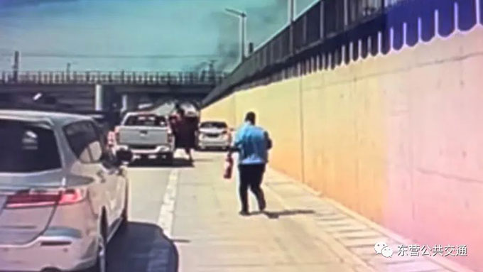 看到前方車輛著火 他提著滅火器跑下車
