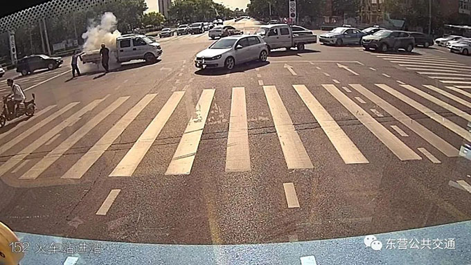 7月15日15:40分左右,東營市公交公司汽車四隊張學成師傅駕駛152路公交車行駛至北一路與西二路路口等紅燈時,發(fā)現(xiàn)前方一輛私家車后斗著火,火苗竄得很高。張師傅見狀急忙拿著車內滅火器跑下車去,對著著火處進行滅火。